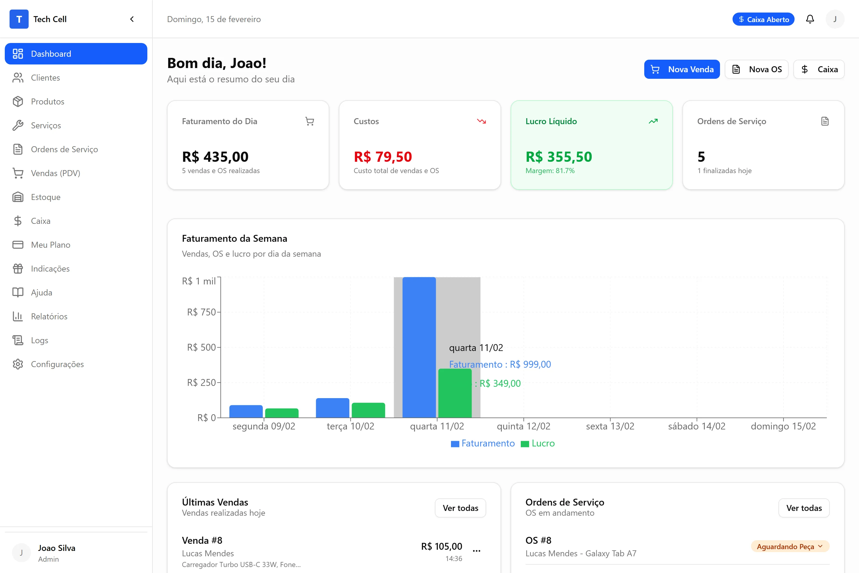 Abra o caixa, crie ordens de serviço, faça vendas e acompanhe tudo pelo dashboard.